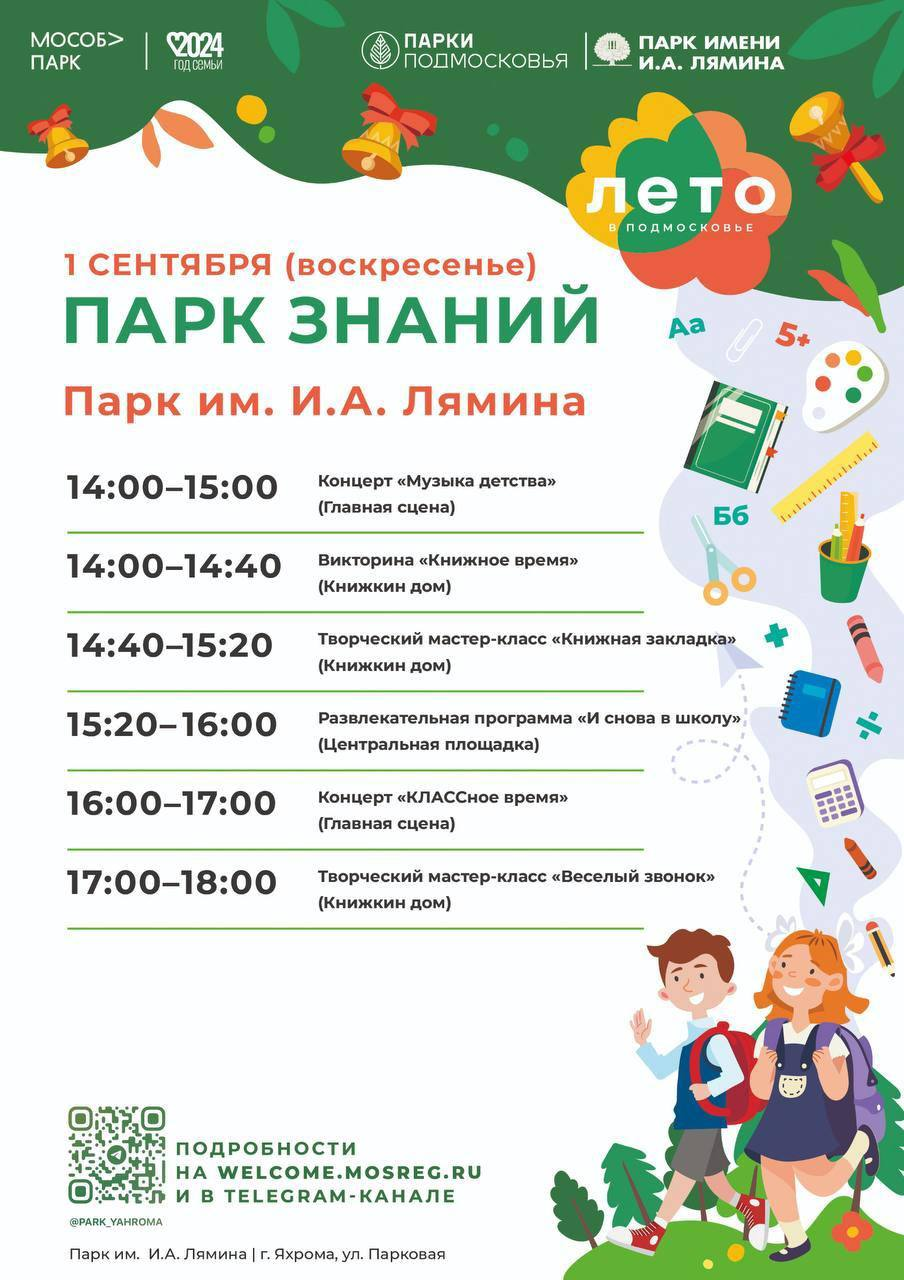 1 сентября📚 в парке И.А. Лямина г.Яхрома🌳 и в парке «Сосновый бор» г.Дмитров🌲состоится общеобластное мероприятие «Парк знаний»📚.
