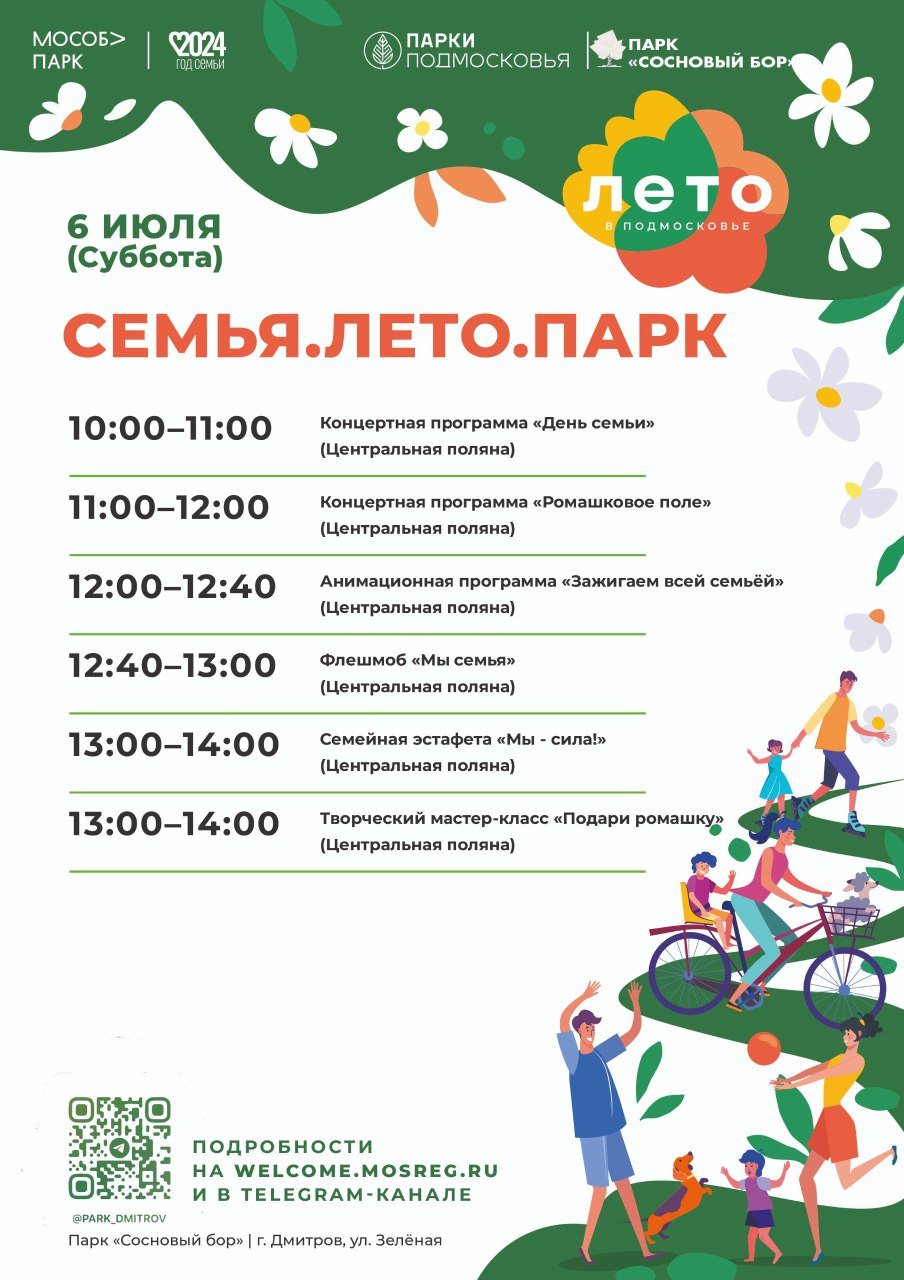 В эти выходные 6-7 июля мы приглашаем всех на праздник, посвященный Дню семьи, любви и верности, который пройдёт в парке имени И.А. Лямина г. Яхрома и в парке «Сосновый бор» г. Дмитров