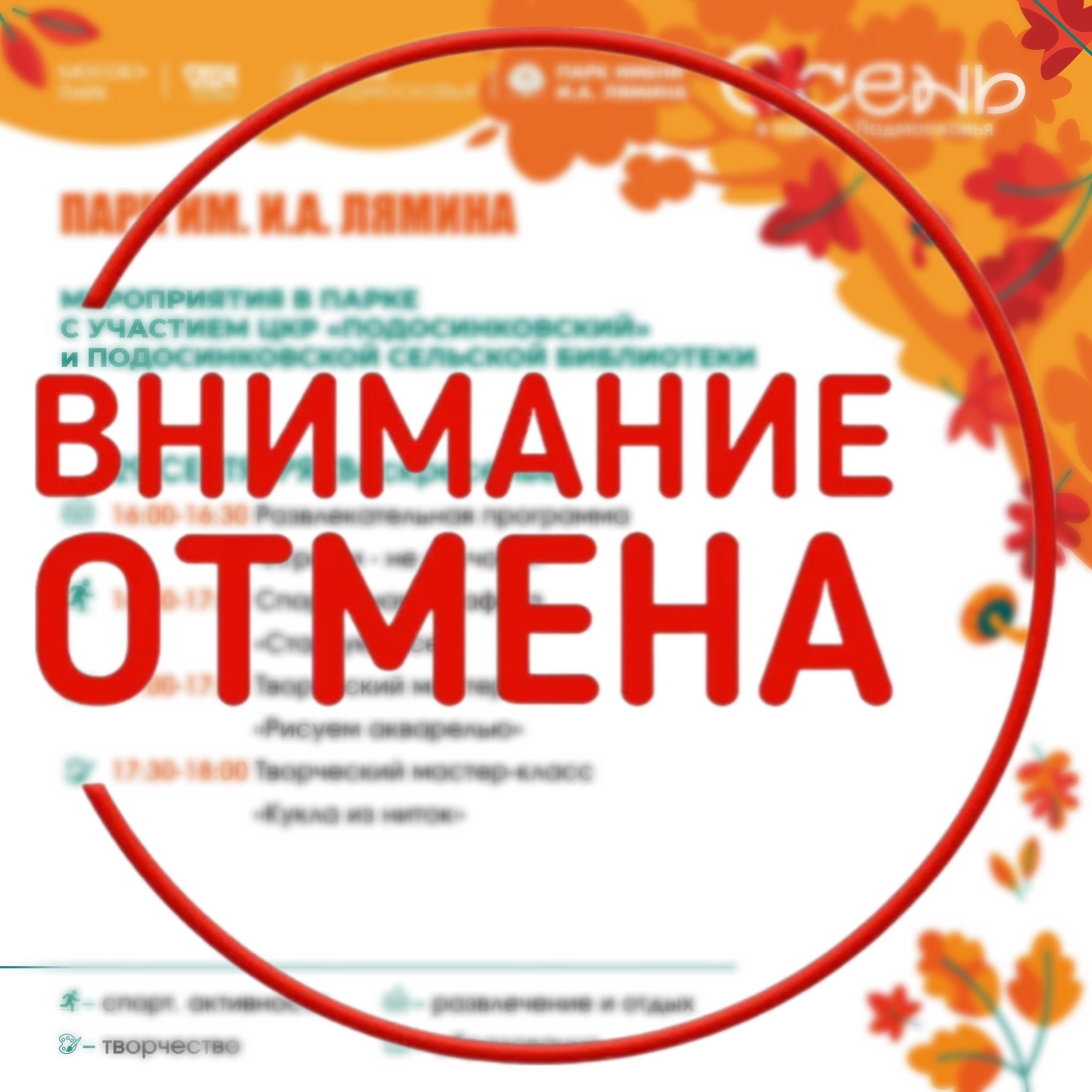 Уважаемые посетители парка им. И.А. Лямина. В связи с неблагоприятными погодными условиями, мероприятия системного расписания запланированные на сегодня 29 сентября отменяются.