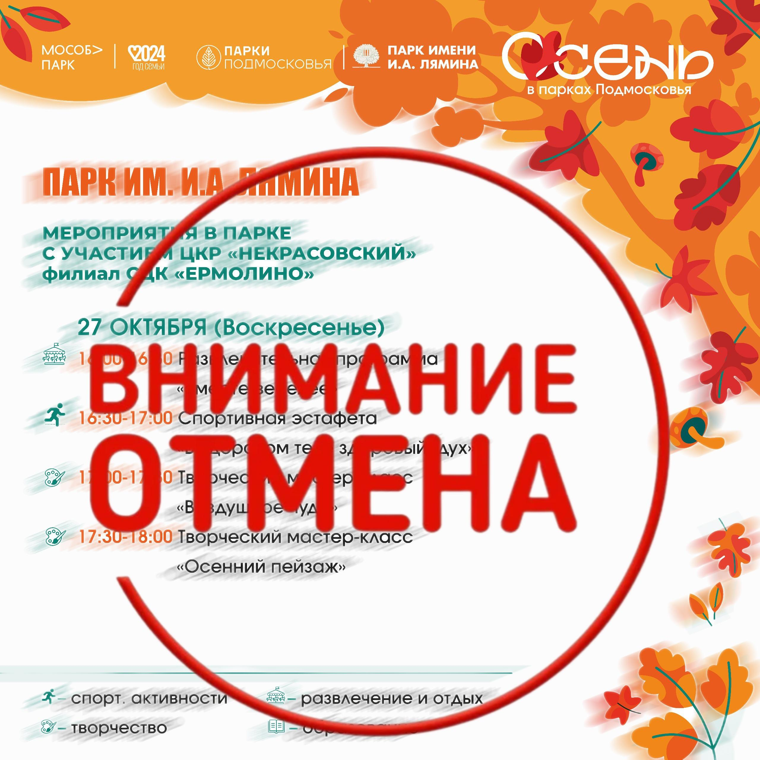 Уважаемые посетители парка им. И.А. Лямина. В связи с неблагоприятными погодными условиями, мероприятия системного расписания запланированные на сегодня 27 октября отменяются.